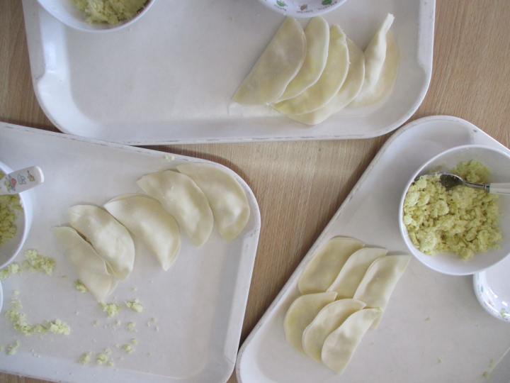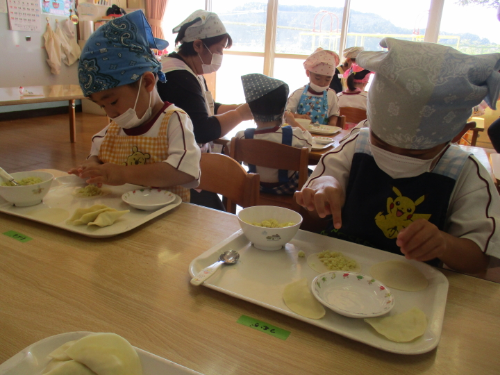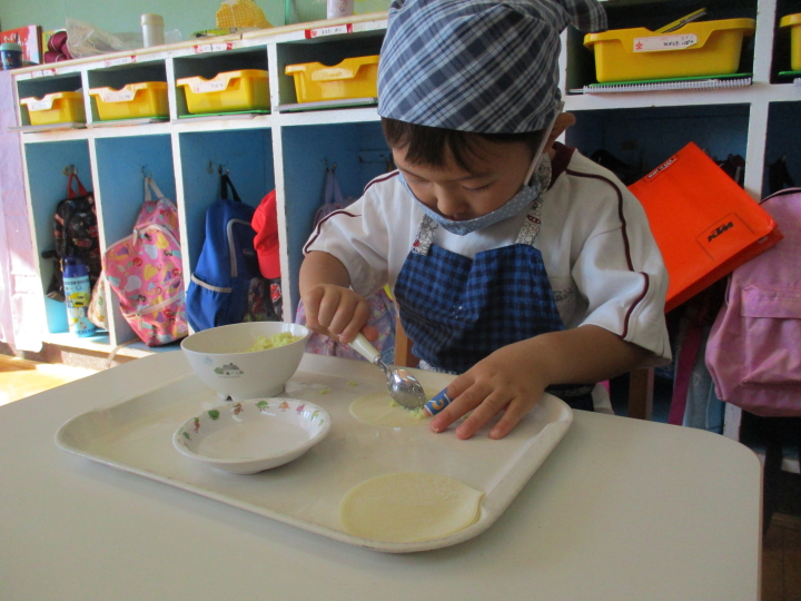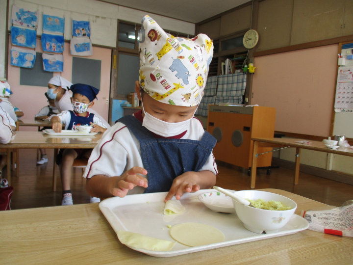 先日のいもほりで掘ってきたさつまいもを使って「パリッとさつま」を作りました。あらかじめつぶしておいたさつまいもをぎょうざの皮に乗せ、皮の周りを水でぬらして包みます。はじめのうちは、うまく皮がくっつかなかったり、具がこぼれおちたりしましたが、次第に上手になって包むことができました。油で揚げて給食でおいしくいただきました。