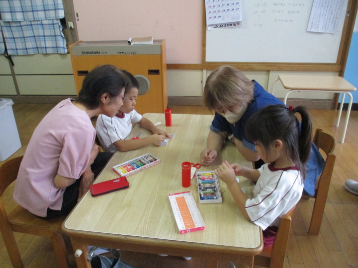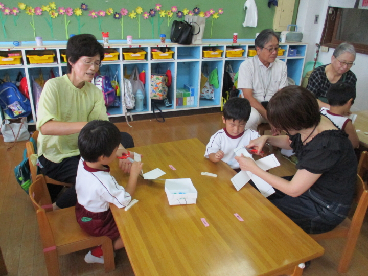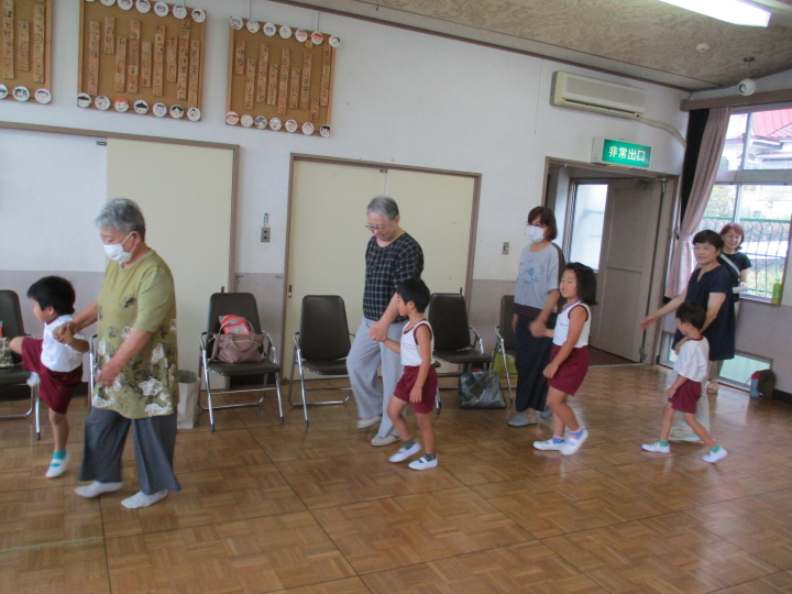 きりん組が「もてぎふれあいの家」を訪問して、地域の方々と交流してきました。歌をうたって聞かせたり、いっしょににふれあいあそびなどをしました。また、かるたあそびでは、絵札探しを手伝ったもらったり競い合ったりしました。最後に、手作りのうちわをプレゼントし、子どもたちもお菓子とゆずもの人形をいただきました。