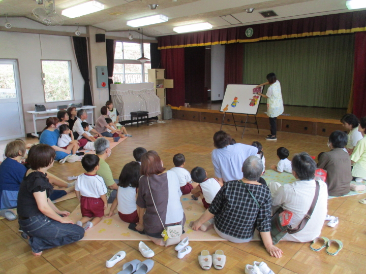 いつも送迎してくださっている方も、別にお住まいで久しぶりに会う方も、かわいいお孫さんの保育園での様子を見ていただきました。大好きなおじいちゃんおばあちゃんを前にして緊張したり甘えたり、子どもたちのいろいろな姿がありました。組ごとの活動の後は、ホールで一緒におゆうぎを踊ったり、映画やパネルシアターを見たりして過ごしました。ご参加いただいた方々どうもありがとうございました。