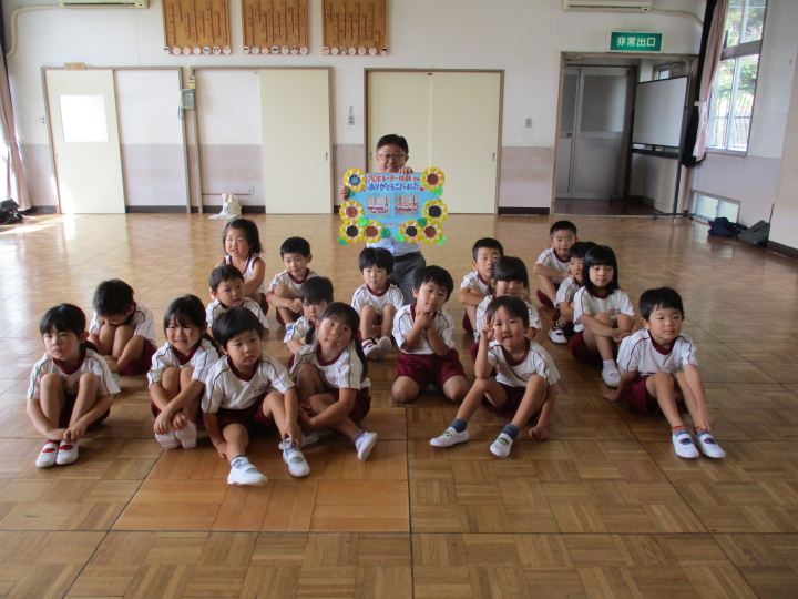 今年度最初の「英語であそぼう」です。年中児は初めてのことでしたが、ブライアン先生の楽しい伝え方と純子先生の適切なフォローで、終始なごやかな雰囲気で取り組むことができました。途中では数字の英語を取り入れたゲームをおこない子どもたちも喜んで参加していました。