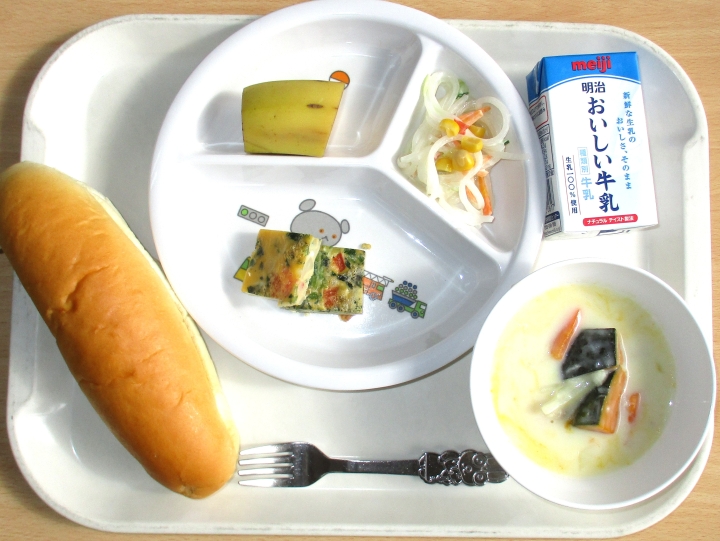 11月18日 コッペパン、かぼちゃのシチュー、野菜オムレツ、マロニーサラダ、バナナ、牛乳