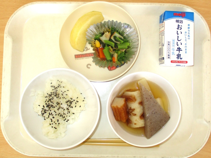 12月26日 ごましおごはん、おでん、小松菜とベーコンのソテー、りんご、牛乳
