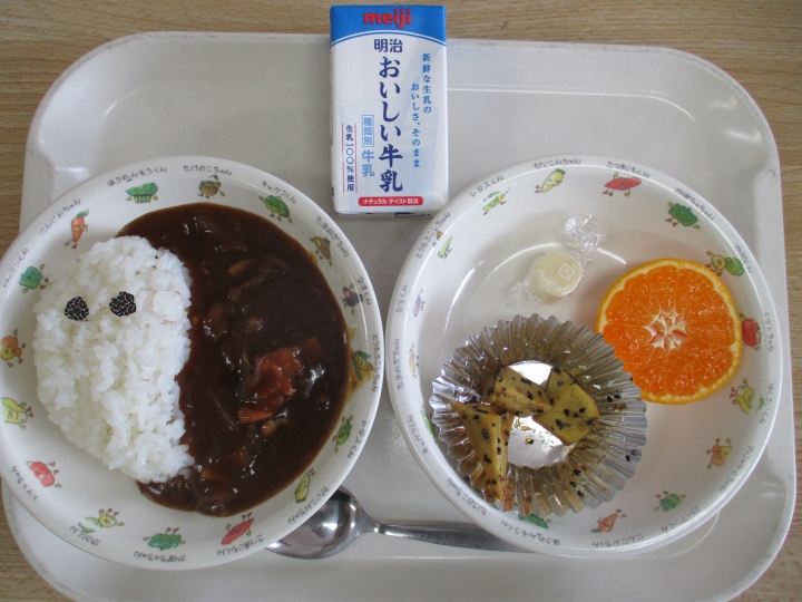 10月31日 ハロウィンのおばけキーマカレー、大学芋、チーズ、みかん、牛乳