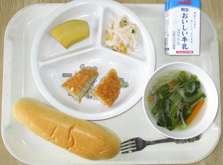 10月22日 コッペパン、チンゲンサイ入り野菜スープ、メンチカツ、春雨サラダ、バナナ、牛乳