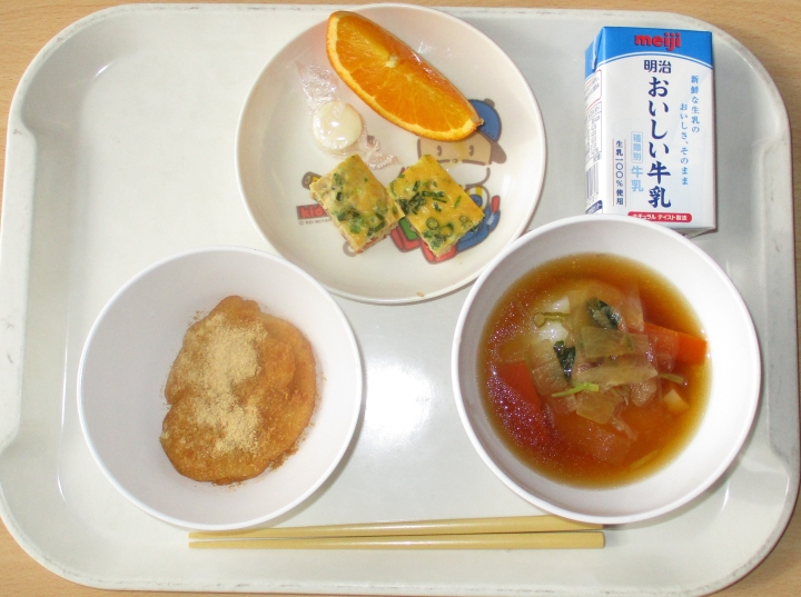 12月11日 お雑煮、きなこもち、千草風卵焼き、キャンディチーズ、オレンジ、牛乳