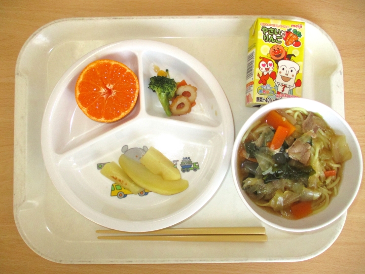 12月17日 しょうゆラーメン、焼きポテト、ブロッコリーの中華あえ、みかん、野菜ジュース