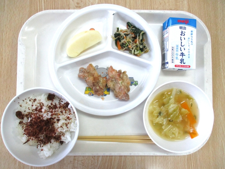 12月3日 おかかごはん、みそ汁、のり塩からあげ、もやしのナムル、りんご、牛乳