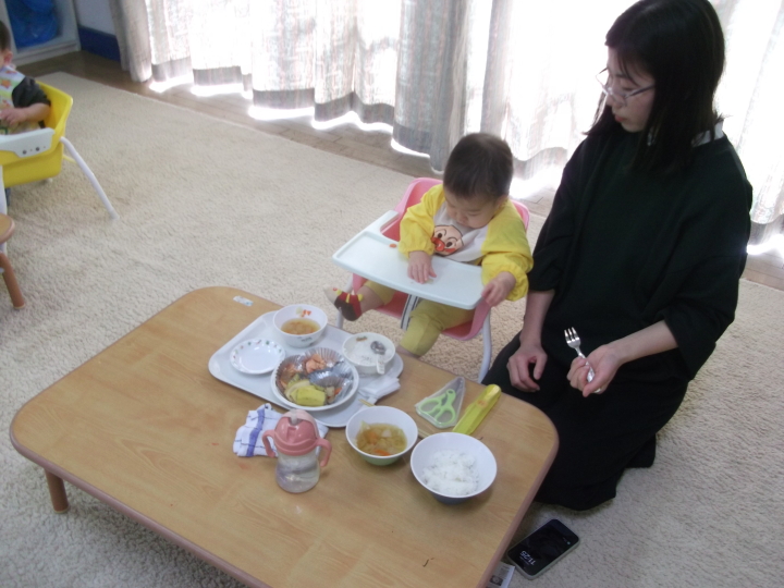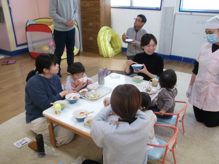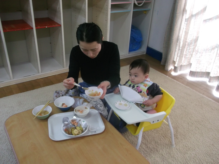 無農薬野菜を使用し手作りしている当園の給食試食会をおこないました。今回は、その野菜を提供してくださる空土ファーム松原さんに来ていただきました。一緒に取り組んでいるみそ作りの話で盛り上がり、実際にみそを見て香りをかいでもらったりしました。子どもたちもそれぞれの月齢にあわせたものを喜んで食べてくれました。ご参加いただいた皆様どうもありがとうございました。
