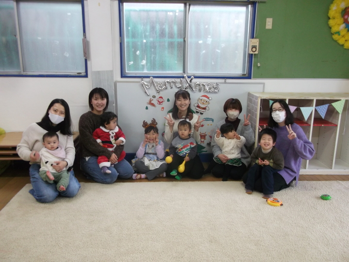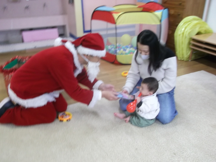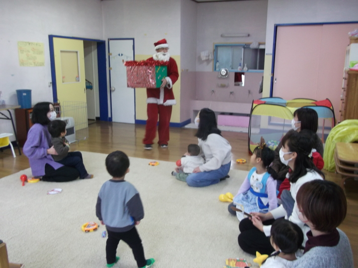 かわいらしいサンタクロースや大好きなキャラクターの服装で来てくれました。子どもたちには「メリークリスマス!」とプレゼントを渡して、お母さんたちには「今年一年子育ておつかれさまでした!」とプチごほうびを贈りました。みんなで楽しいクリスマスを過ごしました。