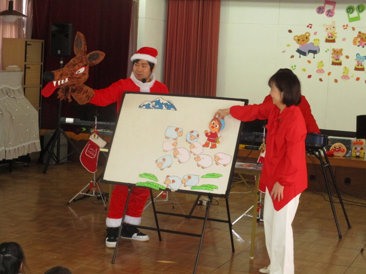 ピアノ教室の先生のユニットグループ「ビビド」の方々が、クリスマスメドレーやアンパンマン、ディズニーの曲を演奏したり、音楽パネルシアター「ひつじかいとおおかみ」を見せてくれました。