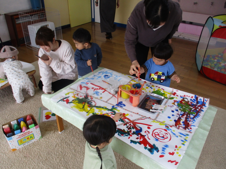 絵の具を使って自由にお絵描きをしました。色が混ざって変化する様子や、筆だけでなくスタンプや手につけてみたりと、思い思いに楽しんでいました。